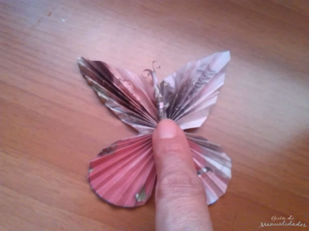 Ya tenemos el palillo todo forrado, este será el cuerpecito de la mariposa. Con la ayuda de otro palillo enrollamos las pequeñas antenas, el papel de revista cederá fácilmente al enrollado y nos quedarán ambas como un rollito. Ver foto 19. Ponemos pegamento a lo largo del cuerpecito y lo pegamos encima de las alas como se muestra en la foto 20, ya tenemos la mariposa hecha.