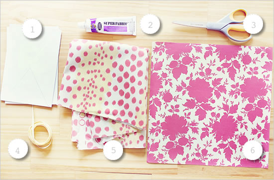 Cortamos el cuadrado de tela de 20×20 tal como vemos en la imagen 1. Marcamos el centro de la tela por la parte interior que no tiene estampado, doblamos los laterales y el lado inferior hasta el centro, procurando que el pico inferior quede ligeramente por encima de la marca del centro. Doblamos sobre sí misma la tela del pico inferior un par de veces y pegamos este lado y los laterales con el pegamento para tela. Envolvemos el sobre de tela con la cinta.