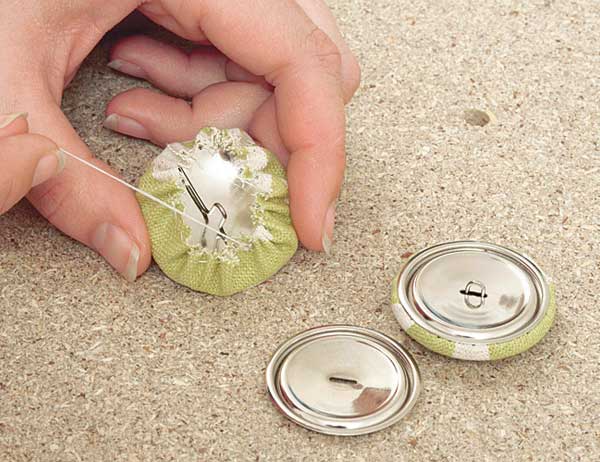 Forramos los botones de tapicero con unos círculos de tela, los cuales habremos cortado unos dos centímetros o menos más grandes que la circunferencia del botón. Pasamos un hilo alrededor de la tela y apretamos, antes de juntar las dos partes del botón colocaremos los pliegues bien repartidos. Unimos la trasera del botón y cosemos a las tablas a través de los agujeros practicados en las mismas. Ya sólo queda instalar los paneles y tendremos nuestro cabecero.