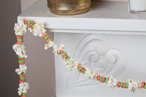 Así como vimos coronas navideñas con materiales comestibles, pensemos que podemos preparar guirnaldas. Cereales, bombones, frutas, verduras, etc. pueden ser los materiales con los que trabajemos.