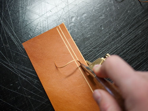 Después con el fileteador realizamos unos rebajes decorativos en el cuero. Esta herramienta se usa normalmente para crear un canal en la piel por donde coserla.