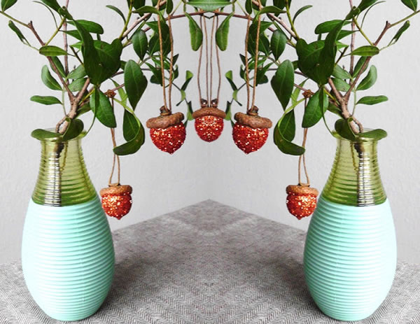 Cuando vi esta idea no pude resistirme. Es sencillamente hermosa y original. Una manualidad que podemos hacer en cuestión de minutos y decorar con ella lo que deseemos. Transformaremos simples bellotas, en detalles decorativos brillantes y llamativos que podremos utilizar no sólo para la época navideña sino también para el resto del año.