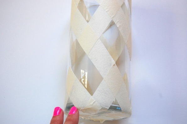 Para empezar pegaremos la cinta adhesiva en forma de espiral sobre el florero. Utilice la cinta métrica para mantener las tiras de cinta adhesiva con una separación simétrica. A continuación pegaremos otras tiras de cinta en espiral pero en dirección contraria. En este punto tendremos formado un patrón de rombos.