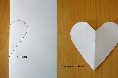 Para comenzar, debemos preparar un molde del corazón. Para ello utilizaremos el papel, al que doblaremos a la mitad y dibujaremos medio corazón. Cortamos y ya tenemos nuestro patrón.