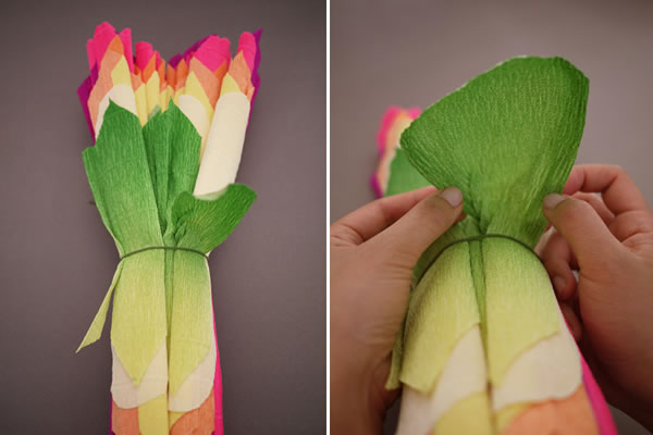 Plegamos desed ambos extremos hacia el centro todos los colores juntos y atamos por el centro con el alambre de floristería.