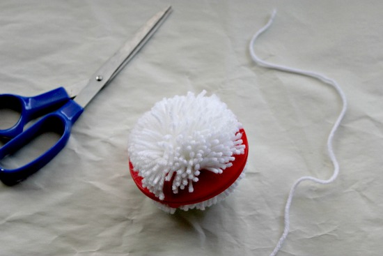 Con las tijeras, corta la lana alrededor del círculo. Ata un trozo de lana alrededor del centro antes de quitar el «pompom maker» para que quede unido.