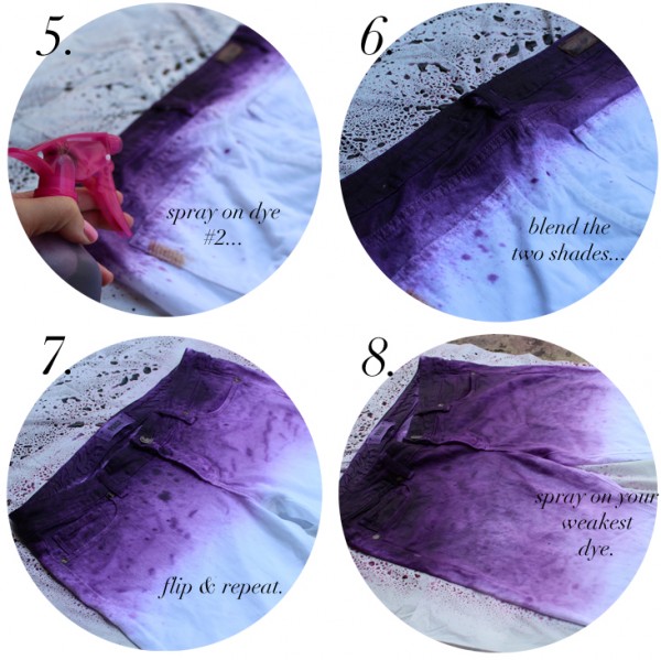 Primero pondremos el pantalón a remojo con agua tibia, después pondremos los plásticos donde vayamos a trabajar y prepararemos las botellas con spray con tres diluciones distintas de tinte. Una con el color más concentrado, la otra a mitad de concentración y la tercera con un poco de tinte tan solo. Las cantidades de tinte dependerán de la marca y el color, habrá que hacer algunas pruebas con un trapo viejo. Pulverizaremos la zona superior del pantalón con el spray más concentrado, por la parte delantera y la trasera del pantalón.