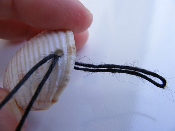 Tira de los cabos sueltos hasta hacer un pequeño nudo, ajustando la correa del colgante a la concha de mar. Inserta la primera cuenta en ambos cordones.