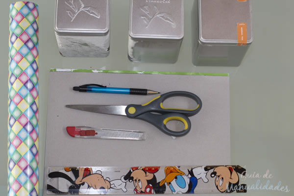 Materiales básicos y sencillos. Puedes buscar el papel contact del diseño que más te guste, o bien uno de diseño liso.