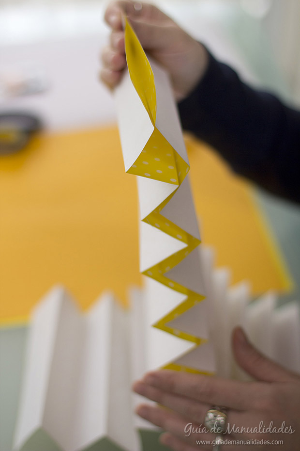Tomamos las piezas de papel que cortamos y las plegamos como abanicos.