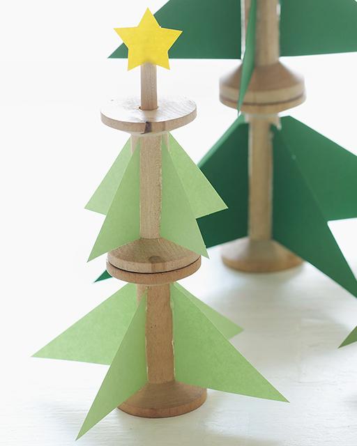 Comenzaremos pegando los carretes de madera apilados, podemos hacerlos de dos o tres carretes, un grupo asimétrico siempre quedará más decorativo. En el centro insertamos y pegamos también las varillas de madera, podemos usar desde pinchos hasta palitos de helado. Pegaremos los triángulos al eje de los carretes tal como podéis ver en las imágenes, los triángulos más grandes en el carrete inferior y en los siguientes carretes pegaremos triángulos más pequeños. En el extremo superior de la varilla de madera pegaremos las estrellas amarillas. En poco tiempo tendremos listos nuestros arbolitos para decorar nuestra casa.
