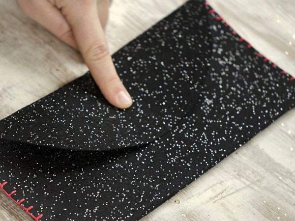 Recortamos la hoja de fieltro al tamaño que deseemos, doblamos como se ve en la imagen superior dejando un trozo libre para la solapa. Unimos el fieltro con alfileres y procedemos a coser los laterales con punto de festón separado.
