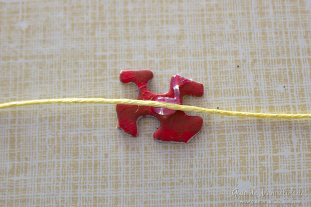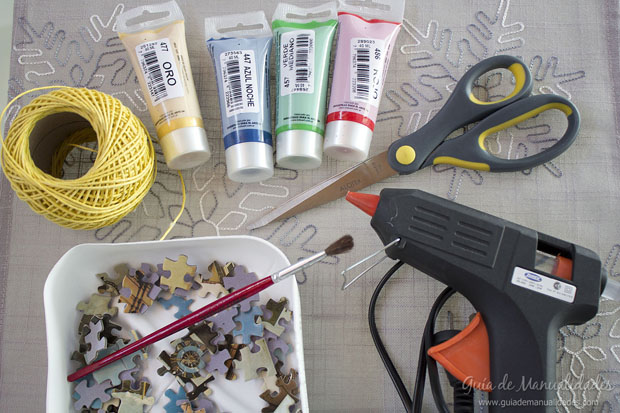 El primer paso para hacer esta idea es pintar las piezas de puzzles. Dicha tarea debemos efectuarla por ambos lados de cada pieza, y pintaremos tantas piezas como sean necesarias teniendo en cuenta que cada punto de la guirnalda requiere dos piezas.