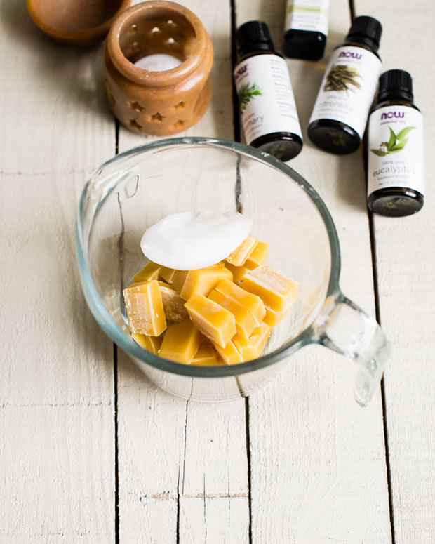 Derretimos tres cucharadas de cera de abeja y una de aceite de coco es la cantidad que necesitamos para un difusor pero obviamente podemos preparar más. Podemos hacerlo en el microondas con un recipiente de cristal o al baño maría usando dos recipientes, uno con agua, al fuego. Uséis el método que uséis procurad trabajar con todas las precauciones posibles, las quemaduras por cera son muy dolorosas y graves. Una vez derretida la mezcla, añadimos 8 gotas de cada aceite esencial y la vertemos en una cubitera, colocamos ésta en el congelador para que cuaje rápidamente. Después desmoldamos la cera enfriada y colocamos unos cubitos en el difusor. Encendemos la vela y en 10-15 minutos se habrá derretido la cera y comenzará a difundir los aromas de los aceites. Podemos añadir más gotas si queremos un olor más fuerte.