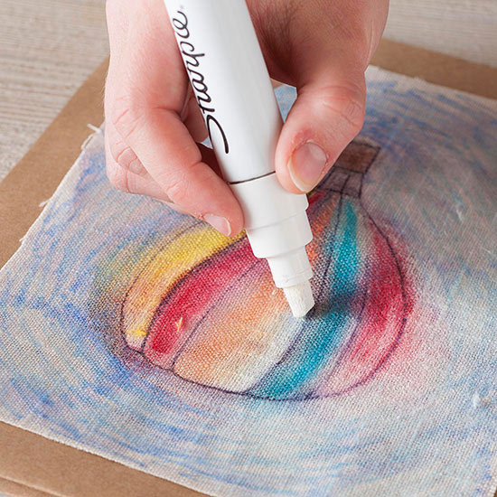 Una vez seco el alcohol y los colores crearemos unos reflejos blancos con el marcador blanco. Éste tiene que ser de base oleosa para cubrir bien los colores que hemos usado anteriormente.
