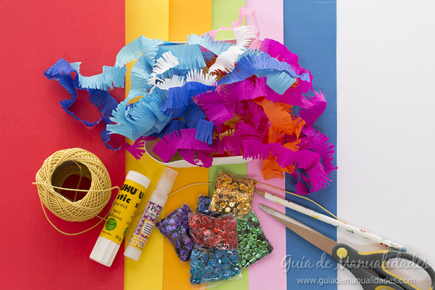 También tenía listo el papel crepé que he cortado en tiras y combinado por colores, colocando un gancho con la grapadora para que sea más sencillo.