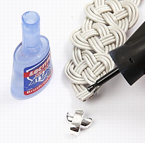 Una vez más unimos los cordones de este lado con el adhesivo que estamos usando y fijamos la otra parte del cierre metálico. Ya tienes lista, una vez seque el adhesivo, tu elegante pulsera de cordón de cuero trenzado.