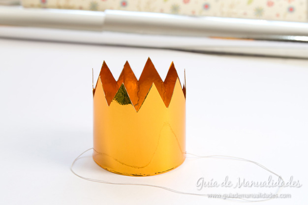 Luego sólo nos resta cerrar nuestra corona, lo que podemos hacer con cinta adhesiva o una grapadora. Luego, hacemos dos pequeños orificios a los lados y por allí pasamos el hilo elástico y anudamos. Preciosa, verdad?