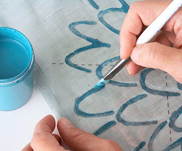 Podemos comprar una plantilla del motivo que más nos guste en cualquier tienda de manualidades. Aunque también podemos crear la nuestra con una hoja de acetato y un cúter. Después sólo hay que decidir el lugar donde irán las impresiones y colocar la plantilla encima de la tela, pintar y después dejar secar la pintura.