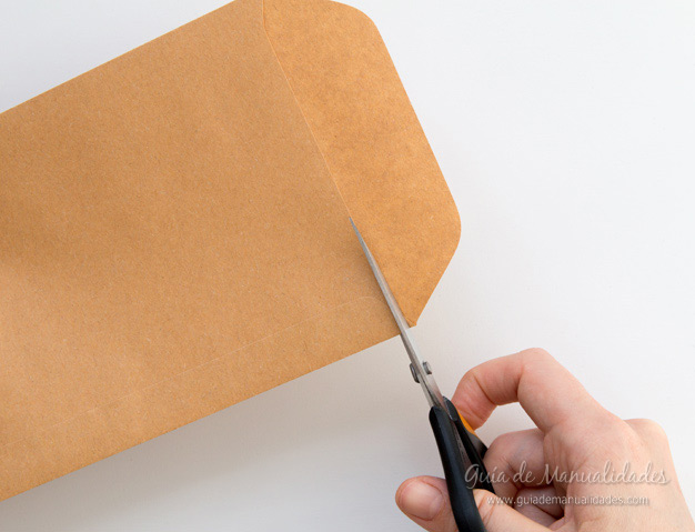 ¡Veamos cómo se hacer esta idea! Lo primero que hay que hacer es cortar la solapa de cierre del sobre. Queremos lograr tener un extremo liso para poder usar las troqueladoras del bordes.