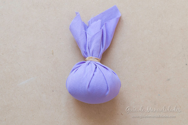 A continuación envolvemos la bola de algodón con la tela (como en la foto) y la cerramos con una goma elástica. ¡Lo bueno de esta idea es que ni siquiera requiere coser! Quedarán unos flecos de tela, no hace falta quitarlos.
