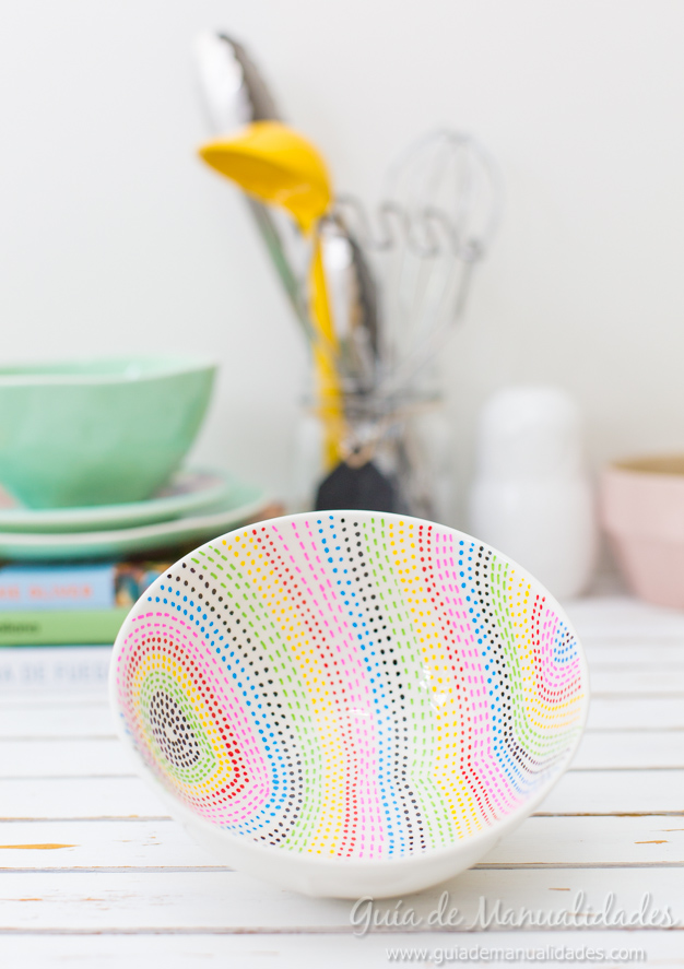 Luego, la parte más linda de esta propuesta… crear los diseños. Yo he optado por hacer dos tipos en esta oportunidad. Una con puntos, que comenzaron por una zona del bol y fueron abriéndose hacia afuera.