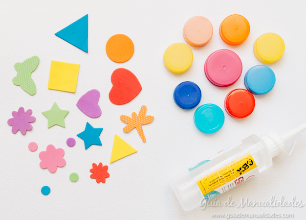 Para esta idea usaremos las tapitas plásticas de bebidas que hemos consumido en casa. Es una buena opción buscar una gran variedad de colores y tamaños para poder usar formas variadas de goma eva.