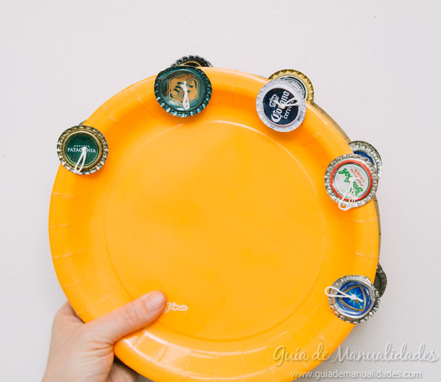La idea es hacer este instrumento reciclando materiales que hay en casa. Sólo es tengan en cuenta que las chapitas de botellas sean metálicas y de retirarles la goma interior antes de trabajar con ellas.