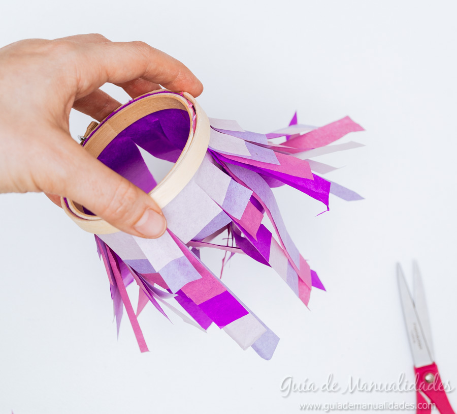 Colocamos todo dentro del aro externo del bastidor de bordado y ajustamos el tornillito hasta cerrarlo. Luego, con la tijera cortamos todo el papel en tiras. ¡Linternas listas!