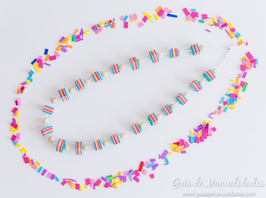 Cuando ya estamos listos, anudamos los extremos del cordón y listo. ¡Una belleza de collar, súper colorido y especial para grandes y pequeños! 🙂 ¡Me ha encantado esta idea DIY! ¿A ustedes?