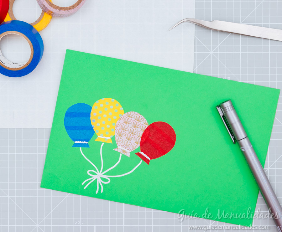 ¡Un clásico muy lindo para saludar en distintas ocasiones! Vamos a hacer un grupo de globitos. Para hacerlos vamos a trabajar como ya hicimos en las tarjetas para cumpleaños. Pegamos trozos de cintas unos sobre otros para poder armar la base para hacer los globitos (siempre sobre el papel manteca que hemos pegado sobre la base de corte). Nuevamente, es importante que los colores y diseños de las cintas contrasten con el color del sobre. Dibujamos los globitos sobre las bases de cinta washi que hemos armado y los cortamos con el cúter.