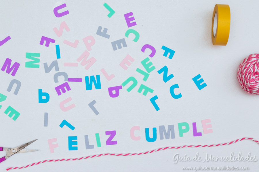 Vamos ahora con la segunda parte de esta idea ¡y me encanta! Podemos incluir el mensaje que más nos guste. Un saludo de cumpleaños, el anuncio de una boda o embarazo y mucho pero mucho más. Como yo quería usar letras en distintos colores, corté el saludo varias veces y en cinco colores. También tengan en cuenta el tamaño de los sobres, de acuerdo a ello, las letras serán más grandes o más pequeñas.