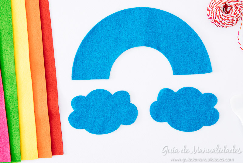 Primero cortamos la base para el arcoíris y las nubes del mismo color y, luego, las demas piezas de colores para armar el arcoíris.