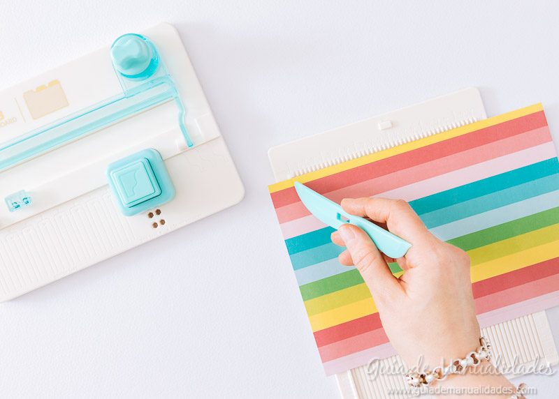 Ya estaba ansiosa por ponerme manos a la obra con este nuevo regalito de Tam de Scrapbooklandia. Y quería hacer una idea para usar sólo la tabla para todos los cortes. Si prefieren hacer alguno de los cortes con un cútter, regla y base para corte puede hacerlo sin problemas.