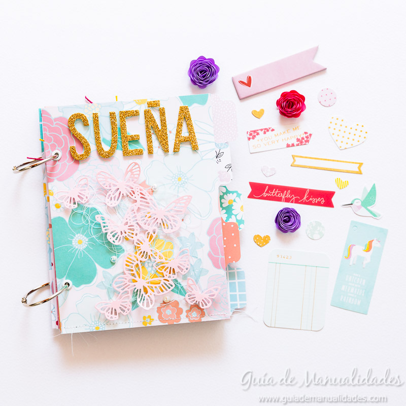Para la portada elegí la palabra sueña ya que es un mini álbum dedicado a alguien especial con muchos sueños por cumplir… Lo combiné con unas media perlas adhesivas, un troquel de mariposas (que pegué con los foam dots) y añadí mucho hilo a la base de ellas. Para darle textura y un detalle único. Usé hilos de coser de poliester en color rosa, blando y celeste.