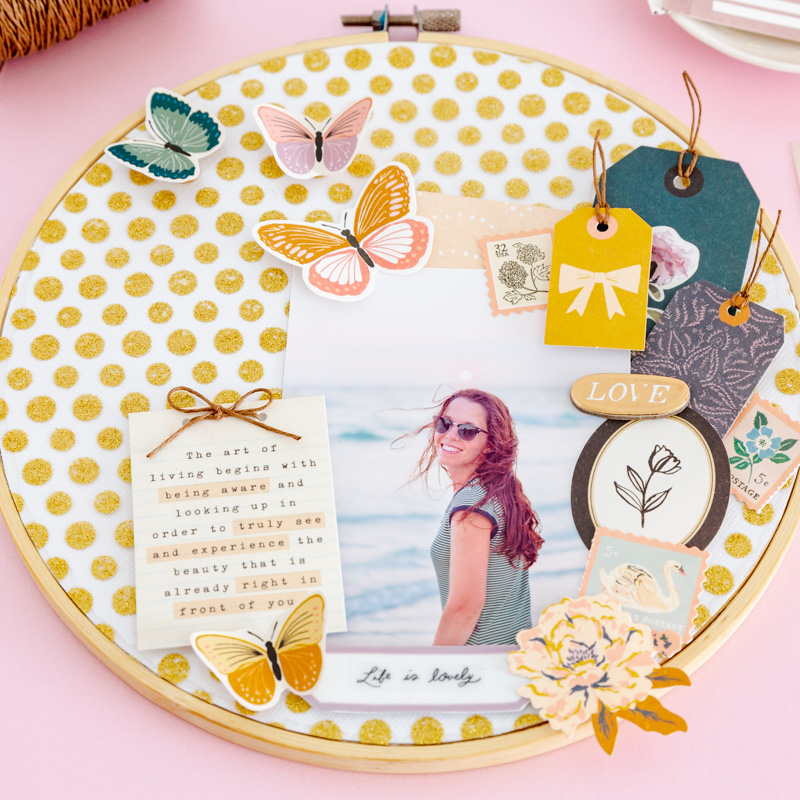 Layout "Life is Lovely" en bastidor de bordado ¡no puedo estar más enamorada! Ha sido mi segundo proyecto de presentación como parte de DT de AMERICAN CRAFTS. Quería hacer una idea que expresara quién soy y que a la vez pudiera hacer lucir los productos de la marca de una forma distinta.