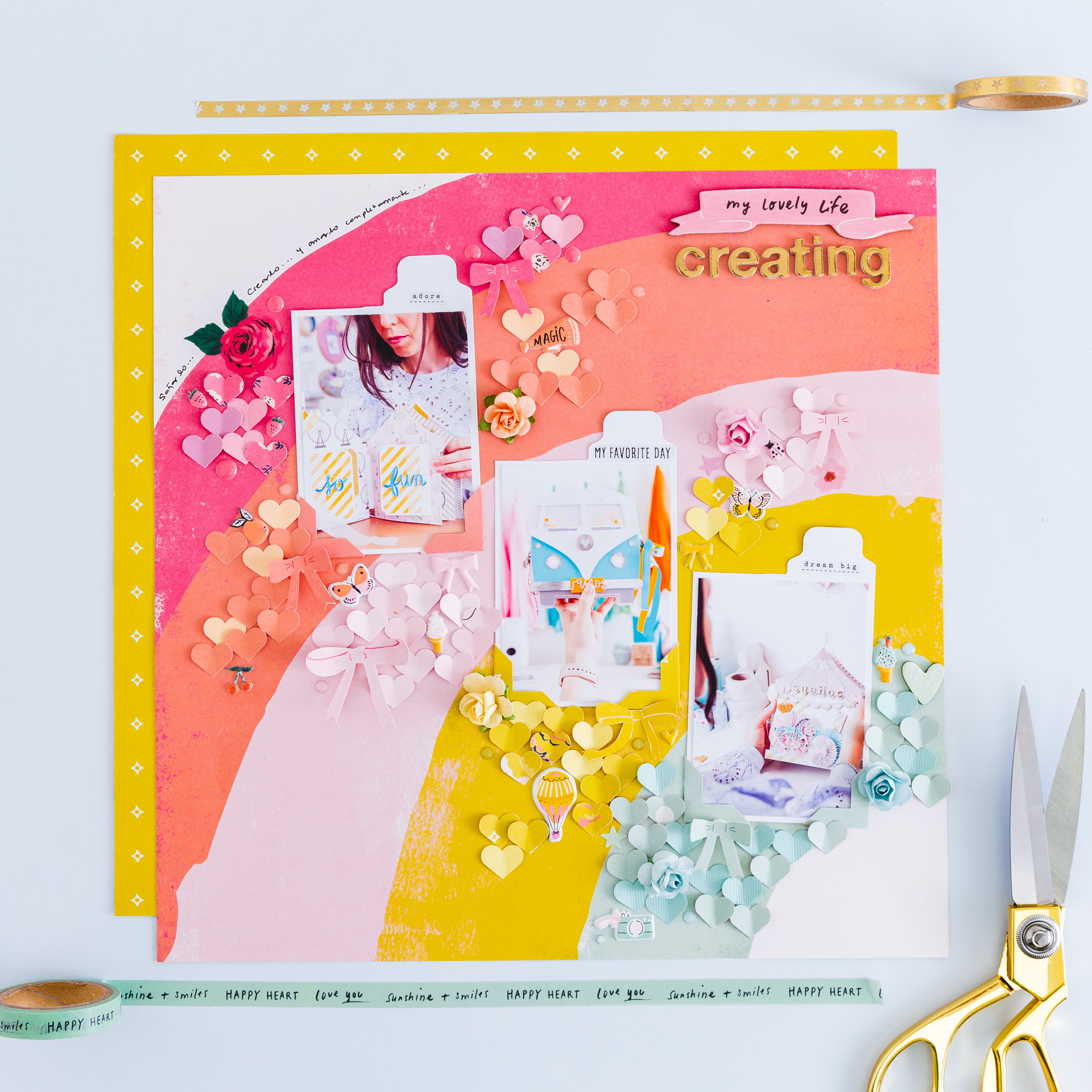 Este layout especialmente realizado para la marca como parte del DT tiene como finalidad la aplicación y uso de distintas herramientas. Además tiene la característica de ser interactivo. Para su elaboración utilicé la TAB Punch Board, el Photo Corner Punch y uno de los layered punches corazón de WE R MEMORY KEEPERS. Cada foto-tarjeta es interactiva. Puede retirarse y leer el journal de cada una de las fotografías.