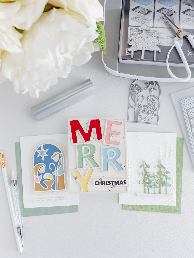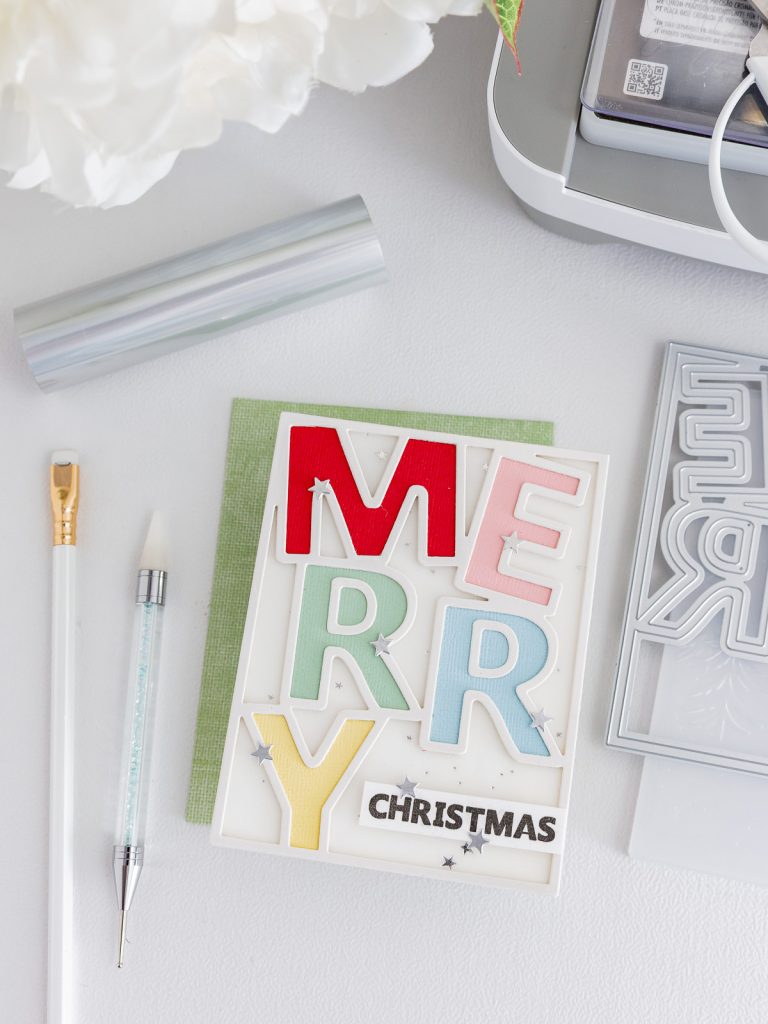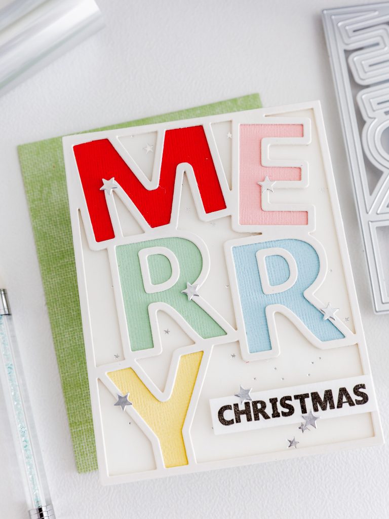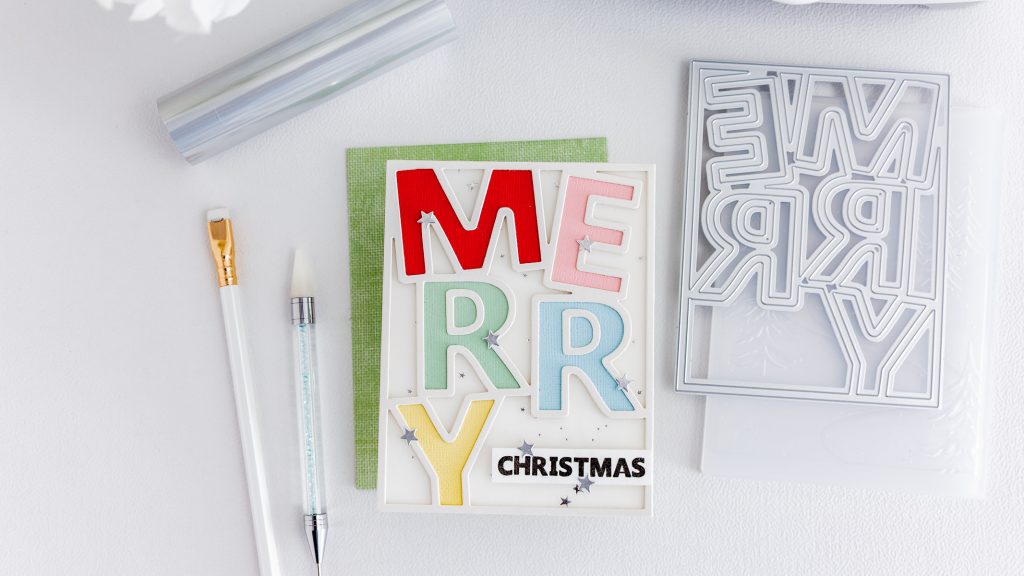 - Color inlays: die-cut the cover from each colored cardstock; inlay the M/E/R/R/Y interiors into the openings. Press flat.