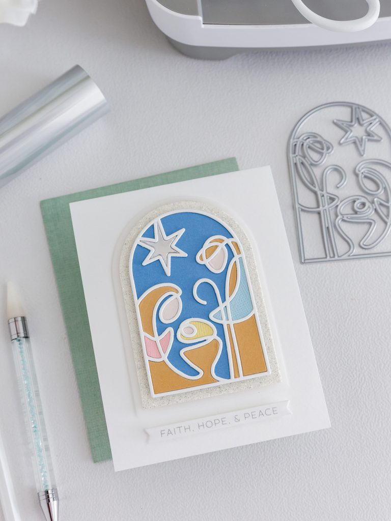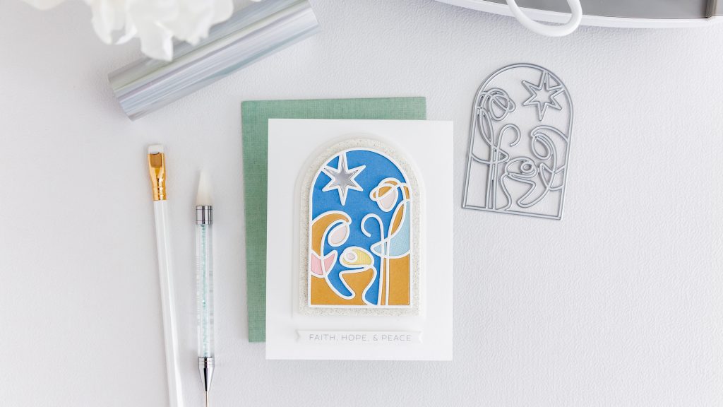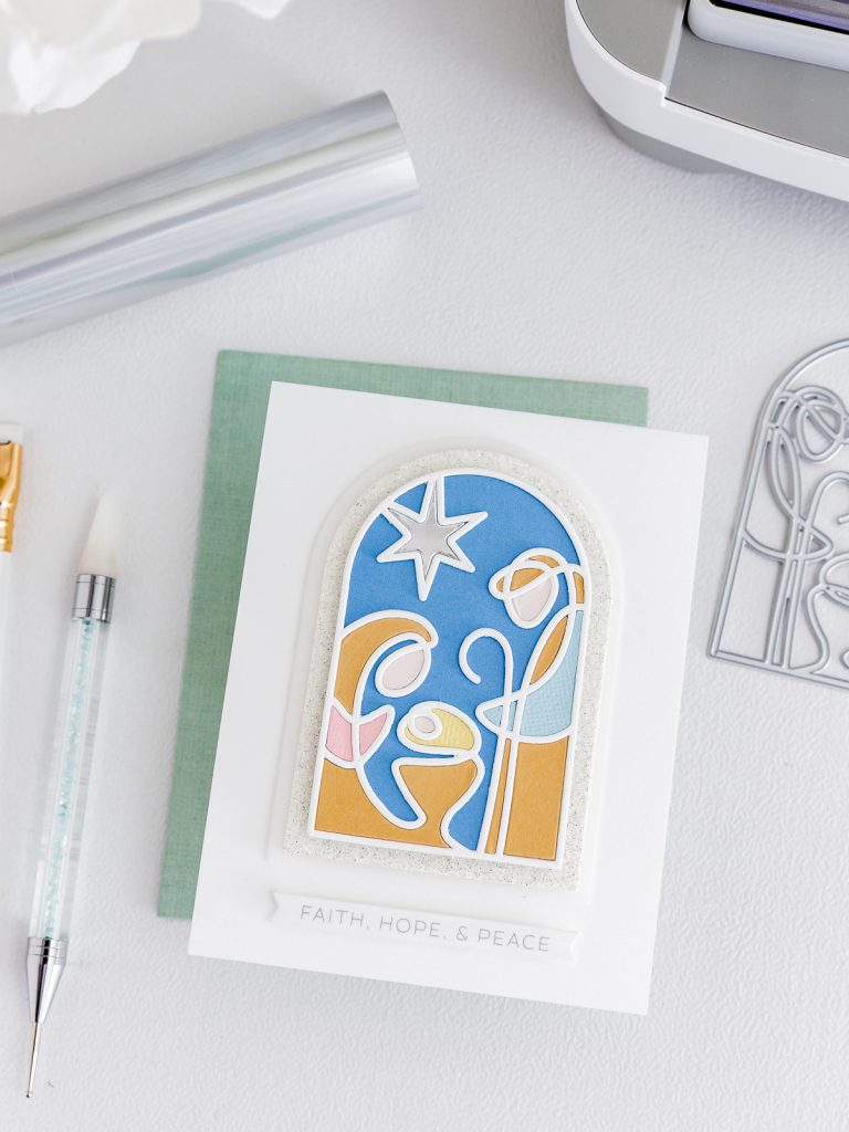 - Assemble the “stained glass”: adhere the white outline to thin scrap cardstock, inlay the colored pieces, and add the silver star.