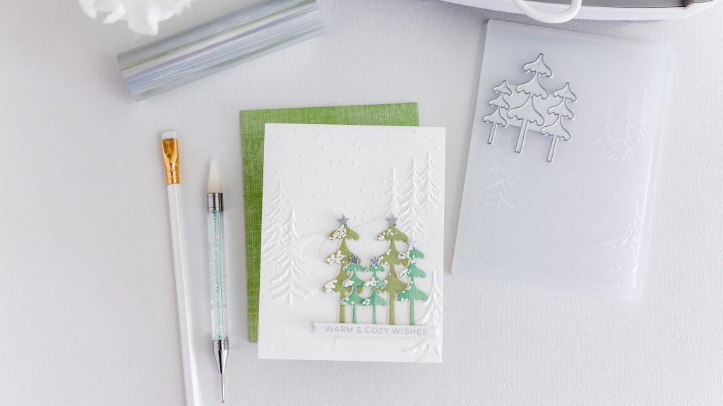 - Die-cut the trees. cut the Frosty Tree Trio once from green cardstock (choose two shades) and once from white glitter cardstock.