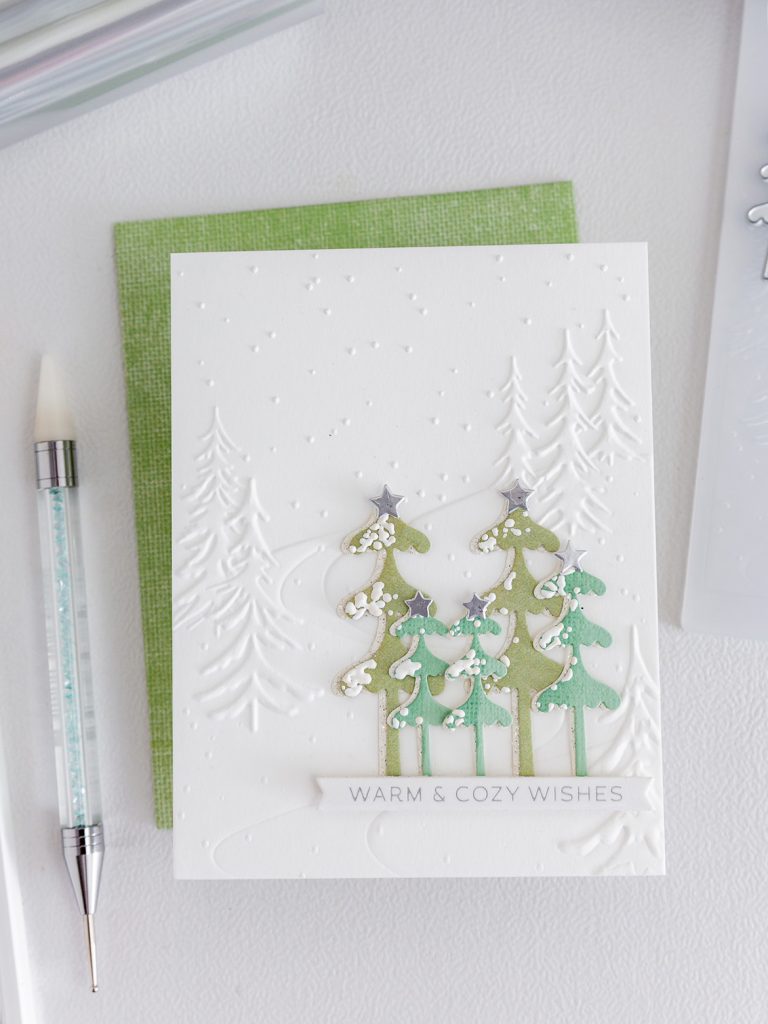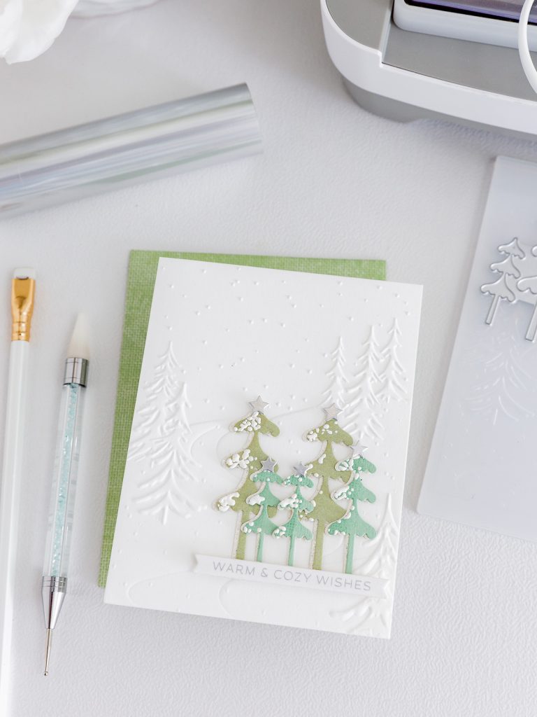 - Add chunky “snow”: tap embossing ink on select branches and tops, sprinkle Ultra High powder, and heat from below until glossy and dimensional.
