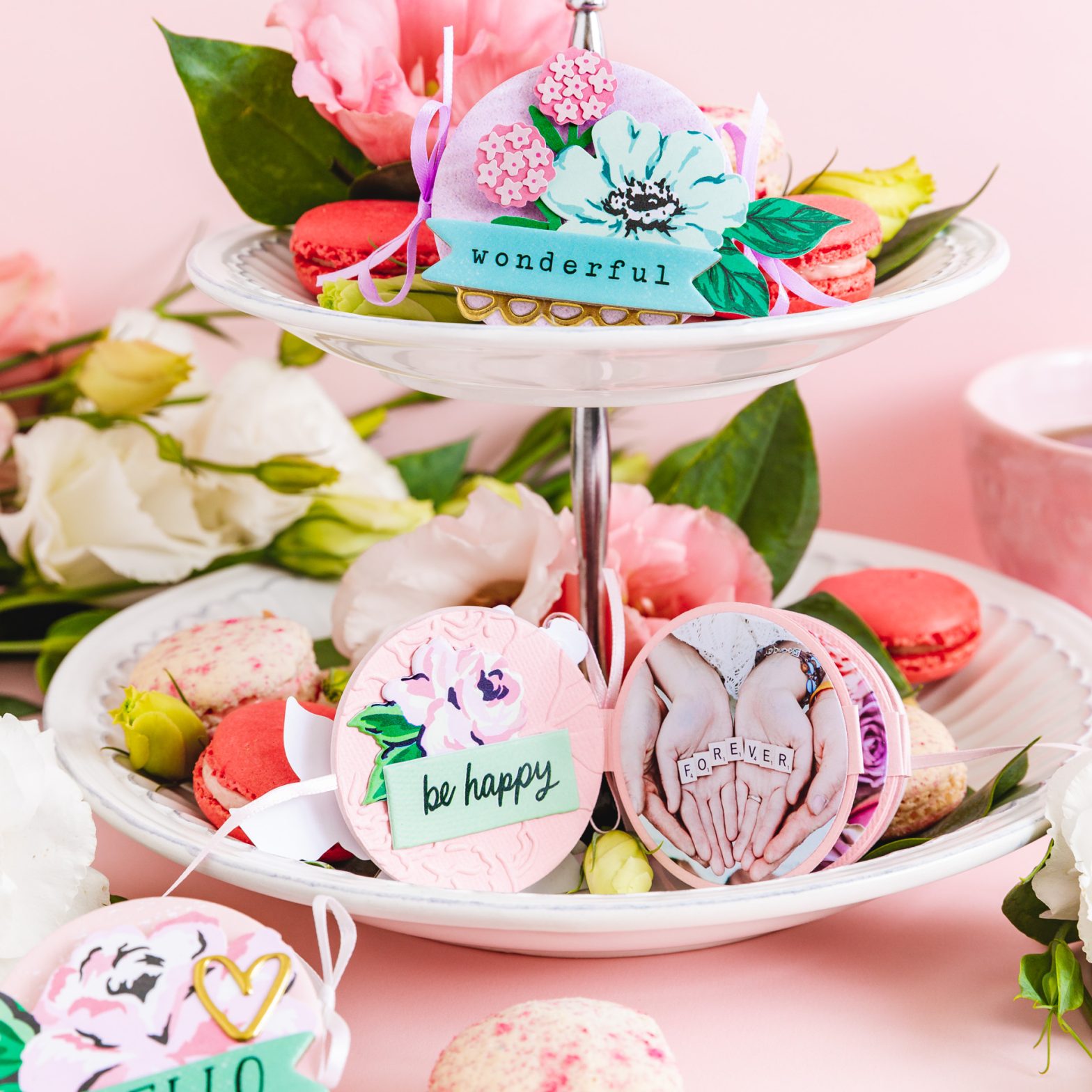 ¡Amo crear ideas originales! Este mini álbum «Macaron» tiene como base 3 herramientas maravillosas de WE R MEMORY KEEPERS. La Button Press, The Works All-in-One y Revolution. Con ellas y la colección «Garden Party» de Maggie Holmes y AMERICAN CRAFTS crearlos fue una increíble experiencia creativa.